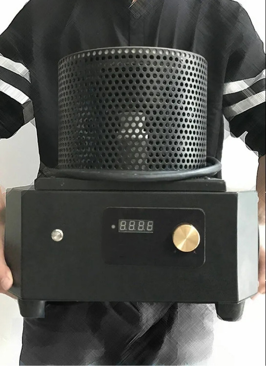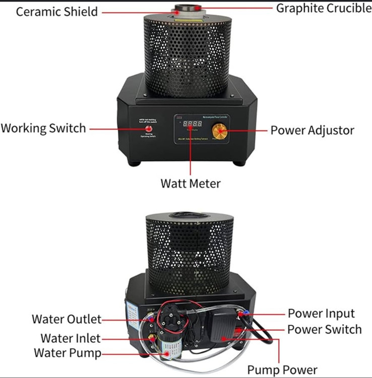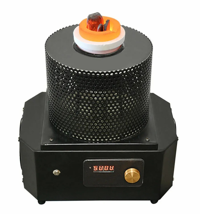 کوره القایی صنعتی پر قدرت مخصوص ذوب طلا و فلزات دیگر نظیر مس ، نقره ، آلومینیوم و ... دارای توان موثر 4KW و حداکثر یک کیلوگرم با فرکانس متوسط بوده همچنین دارای ورودی و خروجی خنک کننده آب میباشد .