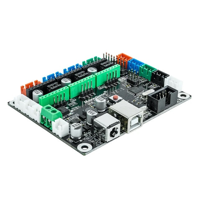 ولتاژ تغذیه درایور 12-24 ولت DC است که از طریق پاور جک به برد متصل میشود. از جمله مزیتهای این کنترلر پشتیبانی از نمایشگر لمسی است که امکان کنترل دستگاه به صورت آفلاین و بدون اتصال به کامپیوتر را فراهم میکند. اجرای فریمور مارلین و انواع پیکربندی مشابه GRBL که نرم افزار های سازگار با آن به راحتی در دسترس هستند و همچنین رابط کاربری مناسبی دارد. اتصال کنترلر به کامپیوتر از طریق پورت USB صورت میگیرد و برای این منظور یک عدد کابل USB همراه با محصول قرار گرفته است. سه عدد خروجی سه پین جهت اتصال سنسورهای اند استاپ محورهای Y، X وZ روی برد قرار گرفته و کنار آنها نیز تعدادی خروجی جهت اتصال تجهیزات جانبی مانند فن تعبیه شده است. ابعاد برد 90*70 میلیمتر است و از طریق چهار پیچ میتوانید آن را به محل مورد نظر متصل کنید