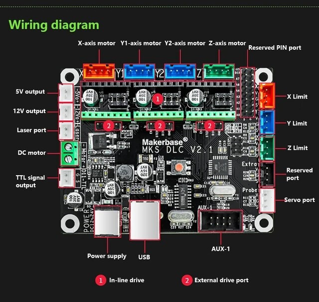 محصول شرکت Makerbase که یک برد open source میباشد و سازگاری با نرم افزارهای کنترلی مثل grbl laser,light burn,benbox,Mdraw دارد و برای ساخت دستگاه های سی ان سی و لیزر استفاده میشود. این کنترلر یک خروجی برای اسپیندل دستگاه CNC و یک خروجی برای ماژول لیزر دارد که به همین واسطه میتوانید در ساخت دستگاههای دو منظوره از آن استفاده کنید. کنترلر مورد نظر از سه محور پشتیبانی میکند و روی برد سه عدد خروجی جهت اتصال درایور استپر موتور تعبیه شده است. فاصله قرار گیری پینها استاندارد بوده و برای ماژولهای درایور استپ موتور مانند درایور A4988 مناسب است. علاوه بر آن میتوانید از درایور هایی مثل TB6600،TMC2100,DRV8825,LV8729نیز استفاده کنید. همچنین میتوانید به وسیله جامپر دو پین نوع micro stepping را تنظیم کنید.